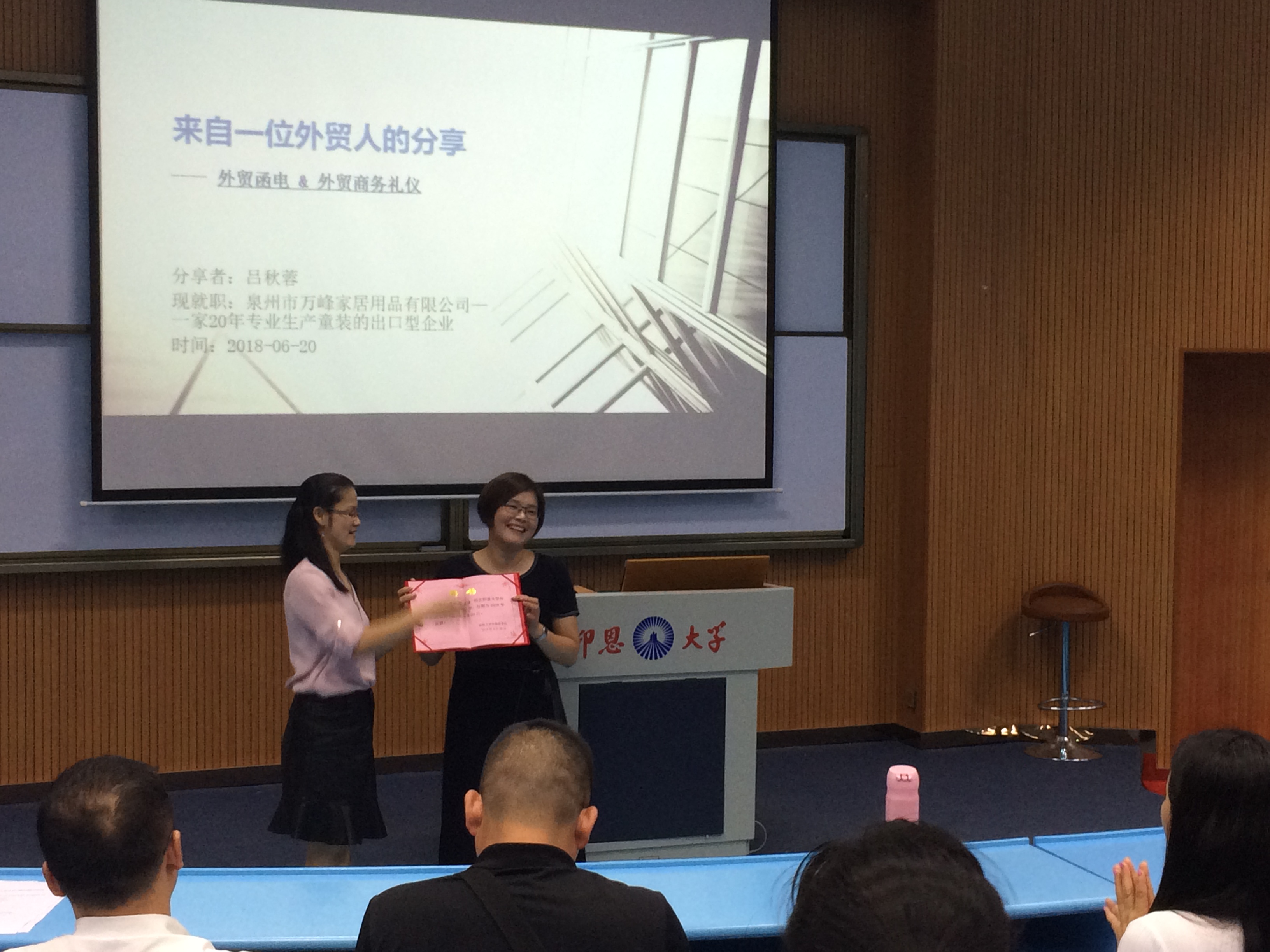 6月20日14时30分,beat365中文登录入口在新区和昌海纳讲堂举行了一场关于外贸函电与外贸商务礼仪的讲座。讲座由beat365中文登录入口院长蔡巧娜副教授主持,特邀泉州市万峰家居用品有限公司副总经理吕秋蓉女士进行授课。beat365中文登录入口全体教师、国贸系主任、英语专业学生和国贸系大二学生到场聆听。