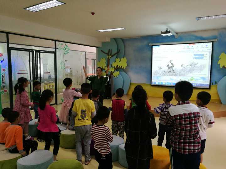 黄安然老师讲绘本现场 本次绘本讲读包含中文和英文两部分,绘本内容符合了4-7岁小朋友的接受范围。中文绘本题为《彩虹色的花》,由张玉老师进行讲读;英文绘本题为《We're Going on a Bear Hunt》该部分则由黄安然老师进行讲读。活动现场气氛活跃,生动的讲解充分吸引了小朋友的注意力并调动了他们的积极性。