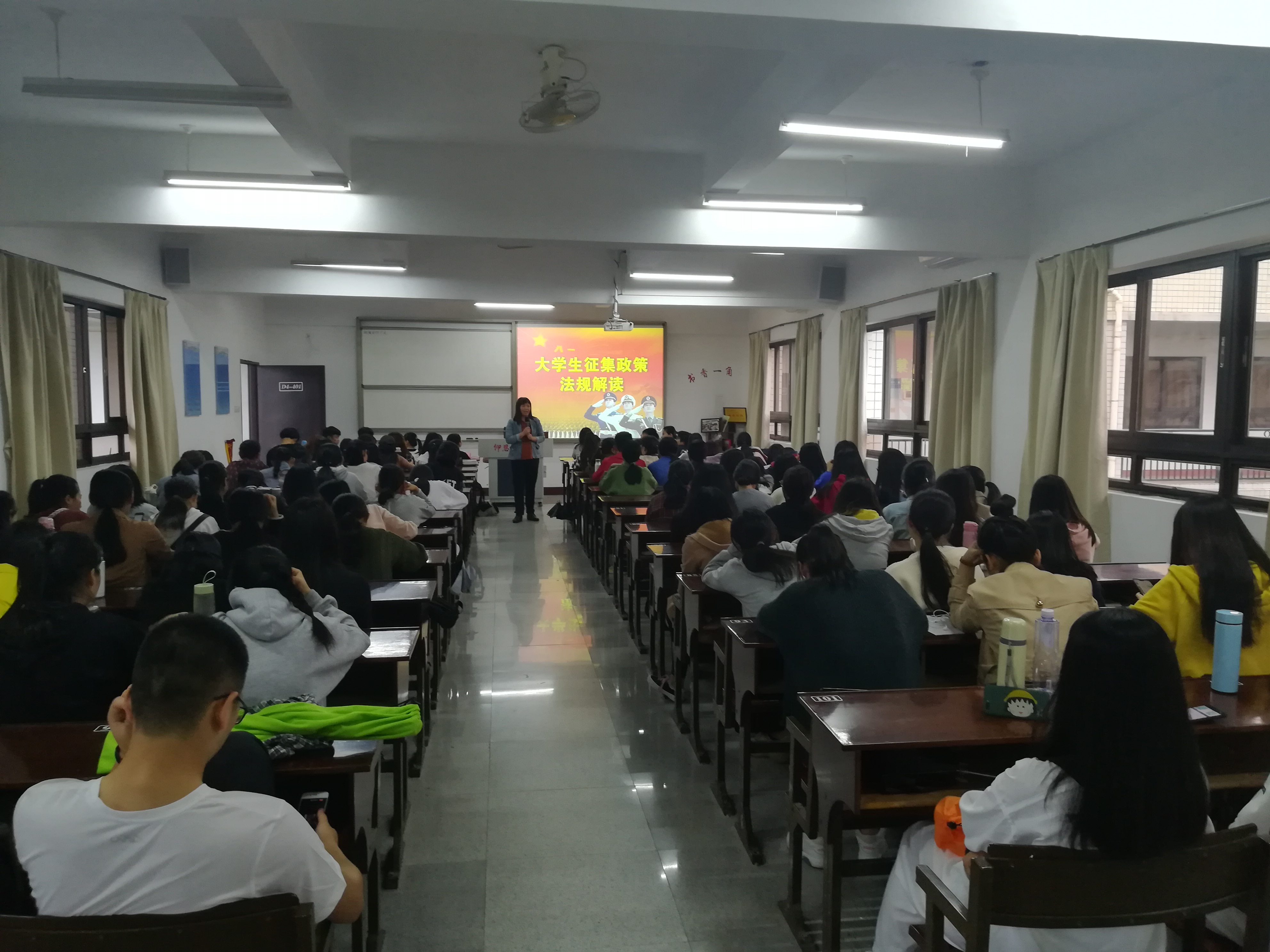 本次动员会采取集中与分散相结合的方式进行,2019年4月11日下午4点先在仰恩楼D4-401教室召开学院征兵集中动员会。辅导员从国家需要、当前国内外形势、学生个人发展前途以及我校的鼓励支持和安排等方面为学生细致讲解国防建设重要性。4点半,各位班主任老师带领本班学生回到各班固定教室做班级动员,观看视频,学习《学习国防教育手册》,详细介绍我校入伍的措施及程序。