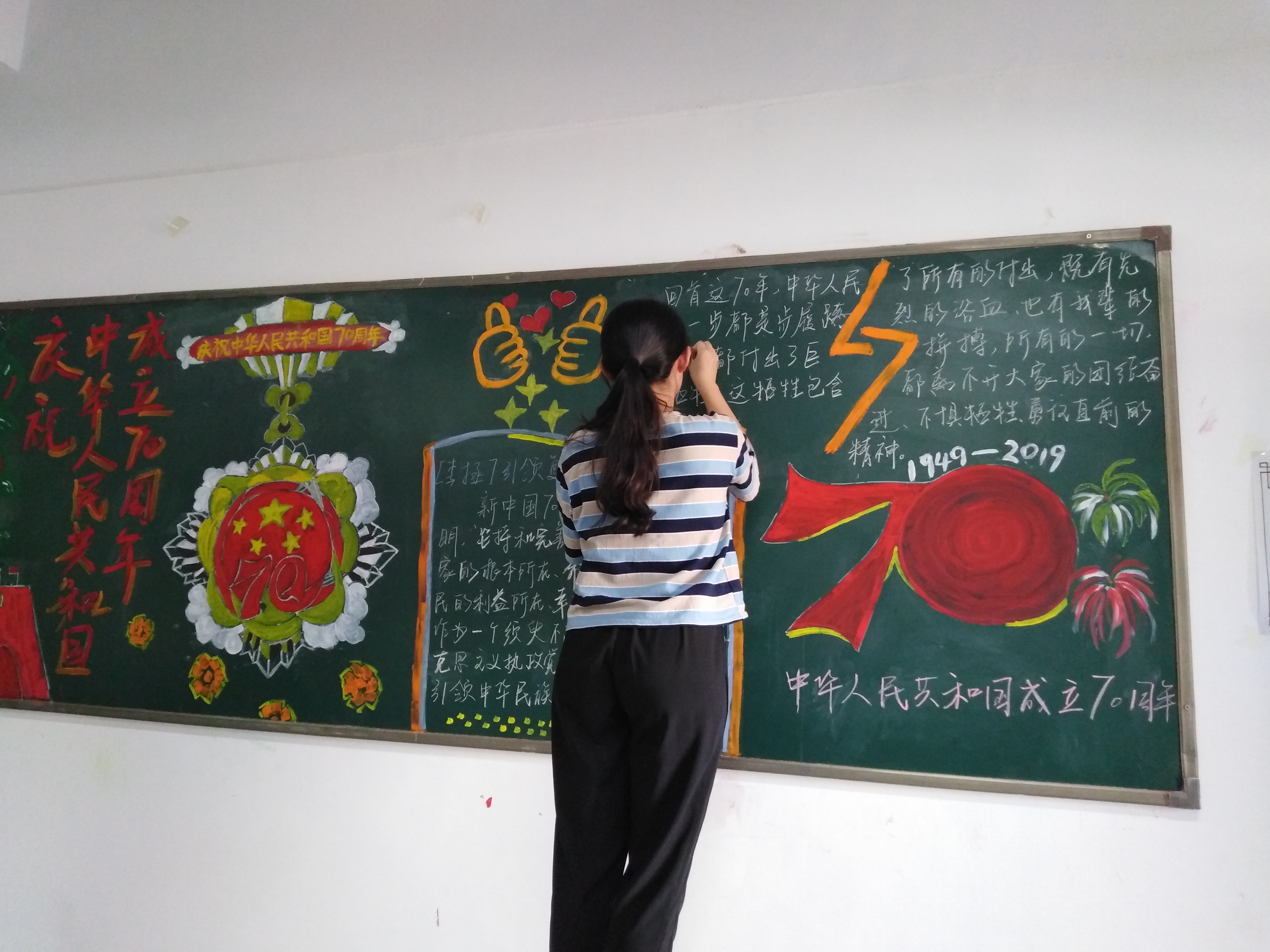 美化黑板报 通过举行黑板报制作这一活动,突出班级意识形态建设,营造庆祝中华人民共和国成立七十周年的氛围,抒发学子们对祖国的感恩爱戴之情。
