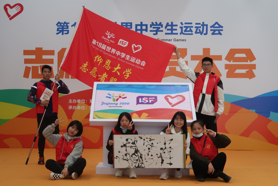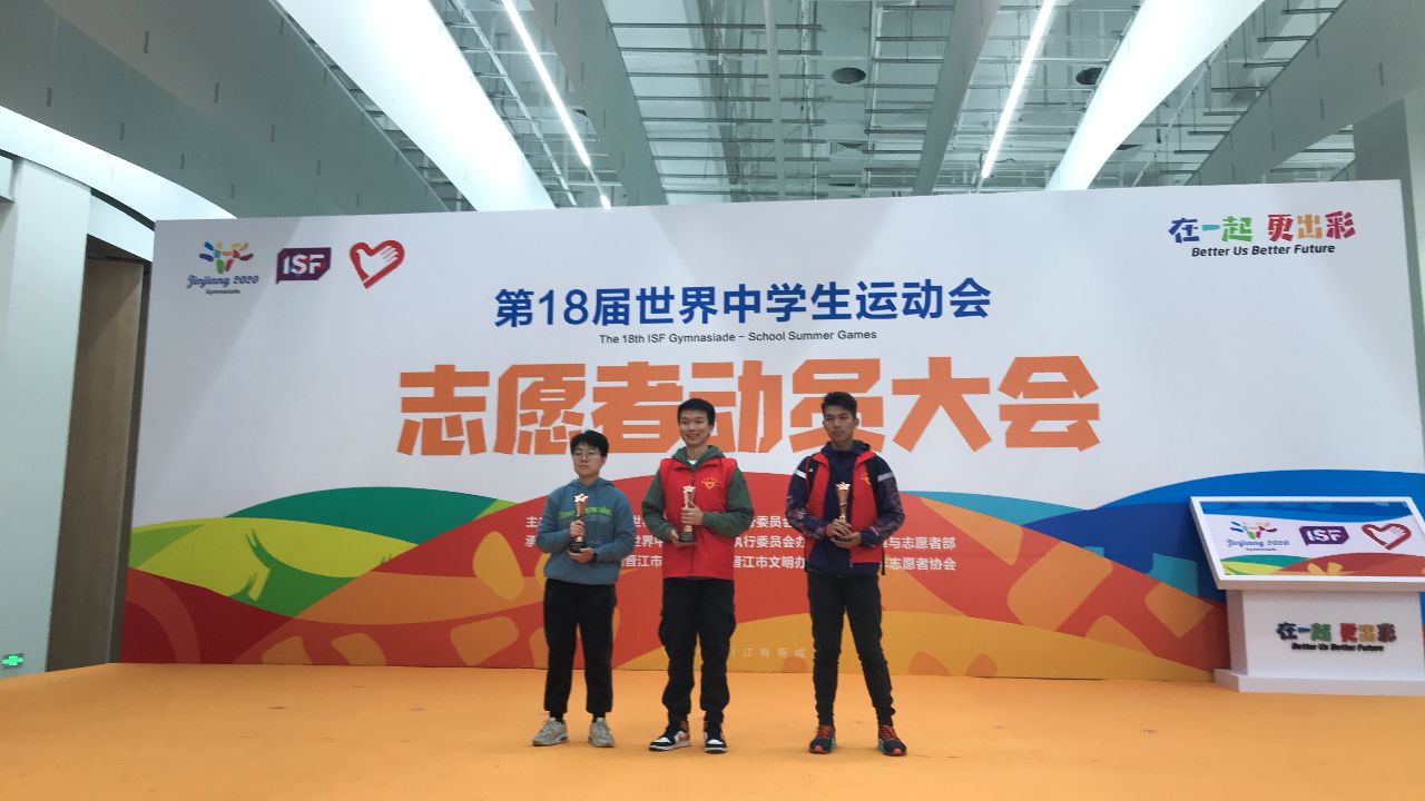 我校派出了6名代表参加,beat365中文登录入口2018级英语2班的谢程航同学作为我校志愿者服务队代表接受了世中运会执行委员会授旗。