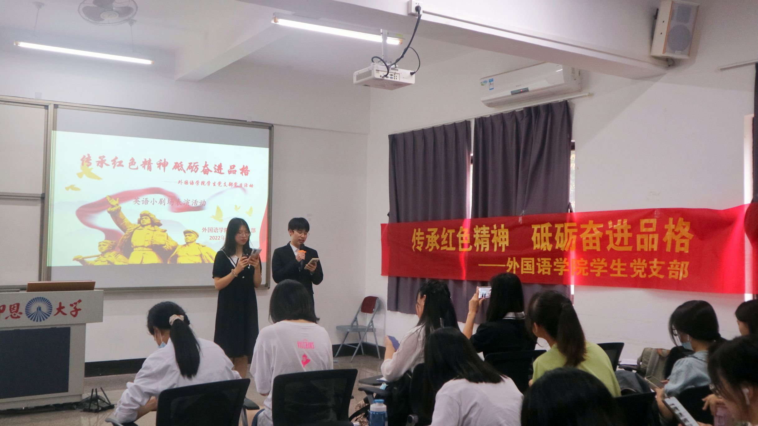 2022年6月15日下午beat365中文登录入口学生党支部在普照教学楼205教室开展 “传承红色精神,砥砺奋进品格”主题党日活动。本次主题党日活动包含两个主要部分:“传承红色文化,弘扬红色精神”主题英语小剧场表演活动和“红色盲盒,传承红色基因”活动。支部书记许淑琴老师,支部组织委员位美娅老师到场并作为评委老师,beat365中文登录入口全体在校学生党员进行活动表演,以及21级全体积极分子到场观看学习。
