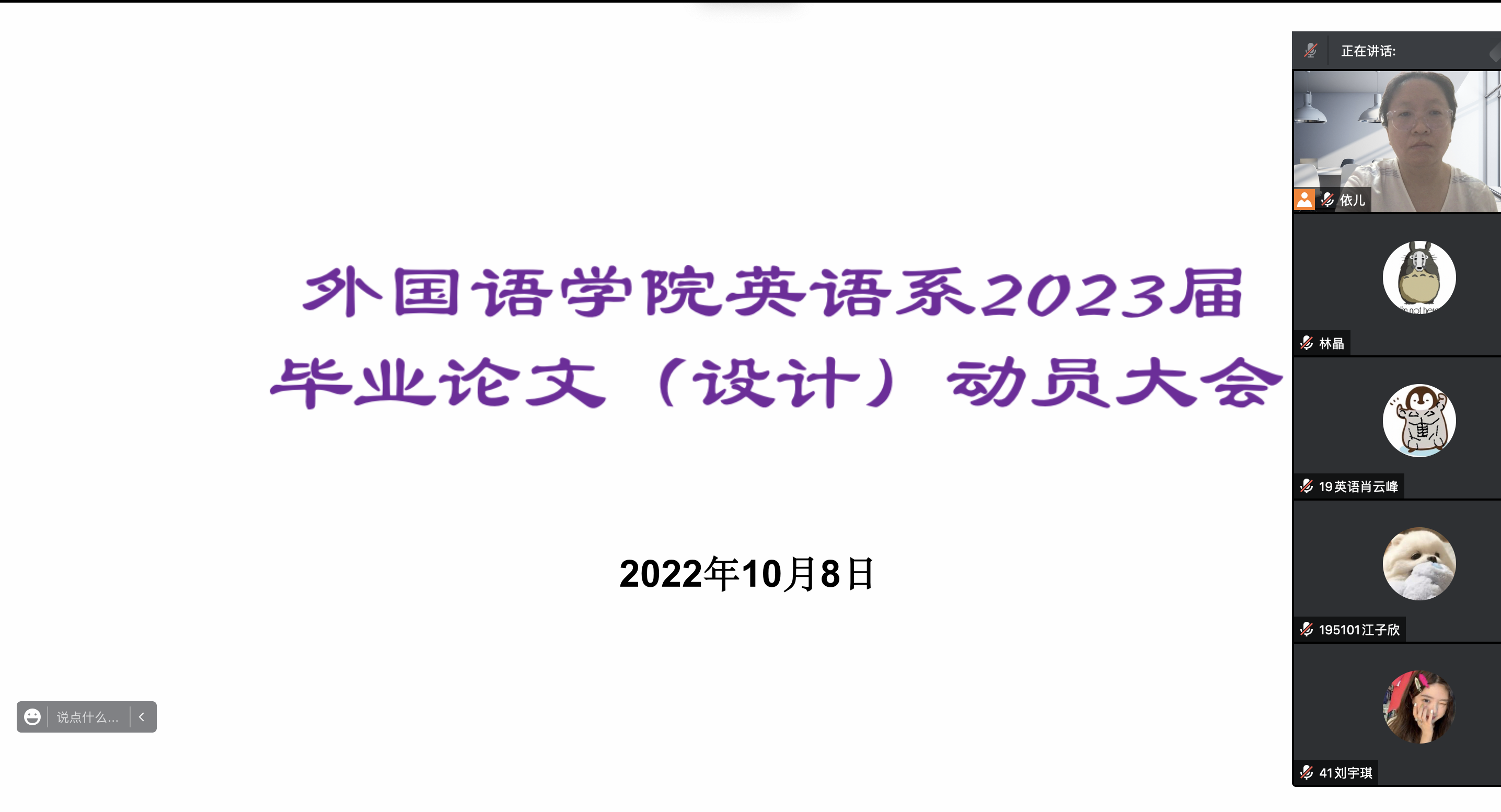 2022年10月8日晚上7点,beat3652023届本科毕业生毕业论文动员大会在腾讯会议顺利举行。beat365中文登录入口副院长林燕媚、英语系主任肖婵婵以及2019级全体本科生和2021级专升本学生参加了本次会议。