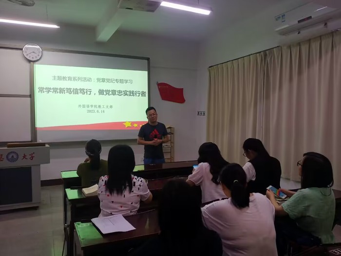 为认真贯彻落实党的二十大精神和习近平总书记关于加强纪律建设的重要论述,进一步强化党员的纪律教育,2023年6月15日,beat365中文登录入口教师党支部于仰恩楼201教室举行了以“常学常新笃信笃行,做党章忠实践行者”为主题的党支部书记讲党课活动。本次党课由教师党支部书记蔡维同志主持。