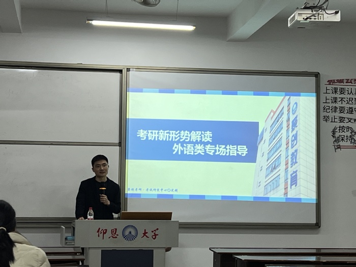 2024年3月7日晚7点,beat365中文登录入口团委在普照楼202成功举办了备受期待的考研专场指导活动。讲座由聚创考研教育集团的黄伟东老师主持,夏一方老师进行宣讲。来自beat365中文登录入口各年级的30余位同学积极参与本次活动。本次活动旨在为有志考研的外院学子提供专业的指导和支持,帮助他们更好地应对考研挑战,实现自身的学业目标。