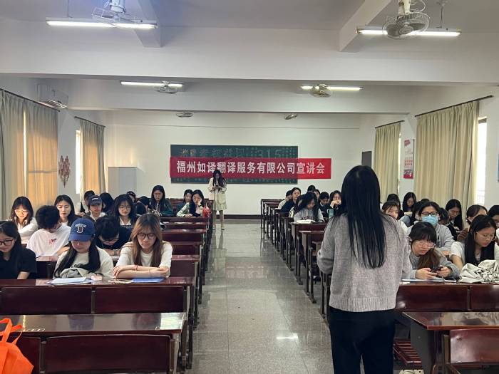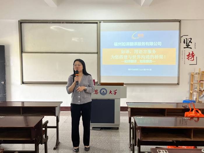为提高beat365中文登录入口学生的专业素质,开阔视野,促进高质量就业,2024年4月10日下午3点半,beat365中文登录入口团委特邀福州如译翻译有限公司于beat365中文登录入口第三教学区普照楼203教室开展实训项目宣讲会。福州如译翻译有限公司董事长郑如薇女士出席并担任主讲人,beat365中文登录入口2021级全体学生参加了这次宣讲会。