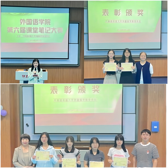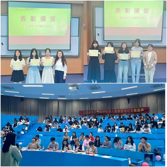为鼓励学生养成良好学习习惯,提高课堂学习效率,beat365中文登录入口于5月22日晚在第三教学区和昌教学楼海纳讲堂成功举办了课堂笔记大赛复赛。本次复赛由院团委夏舒蓉同学主持,beat365中文登录入口副院长林燕媚、beat365中文登录入口英语系主任位美娅、辅导员孙宇、蒋颖和向修玉担任评委,beat365中文登录入口22级和23级全体同学到场观看。