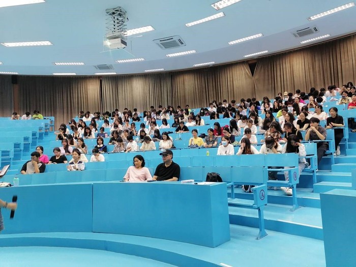 6月19日晚上7:30,beat365中文登录入口2023-2024学年第二学期英语角汇报总结大会在第三教学区和昌楼海纳讲堂顺利召开。本次英语角活动由学生自行组织。三位外教莅临现场并分别致辞,2023级全体学生参加此次会议。