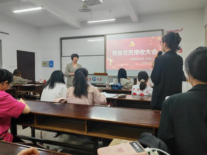 2024年5月30日,beat365中文登录入口学生第一党支部在第三教学区普照教学楼202教室召开预备党员接收大会。本次会议由学生第一党支部书记向修玉同志主持,学生第一党支部副书记蒋颖同志,组织委员李薇同志,宣传委员林梅媛同志,全体党员,预备党员以及入党积极分子出席参加。