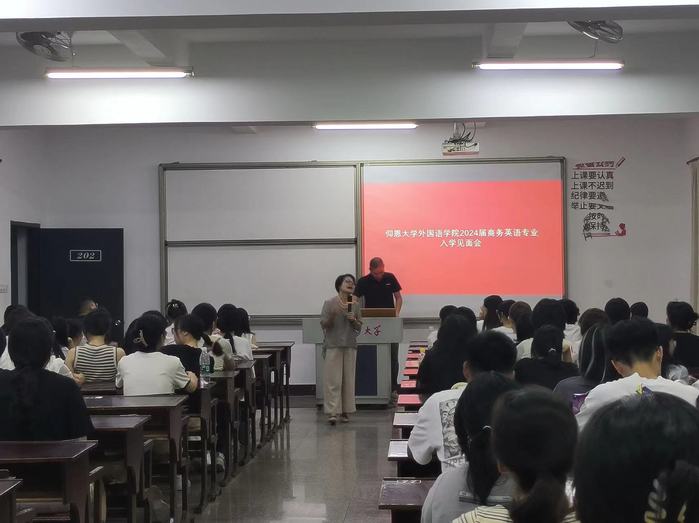 9月10日晚7点,beat365中文登录入口于第三教学区思齐讲堂及普照楼202室召开了分别召开英语系及商务英语系的学科专业介绍会,旨在帮助2024级新生快速了解专业方向和学院团学组织的运作与活动安排。两个会场同步进行。