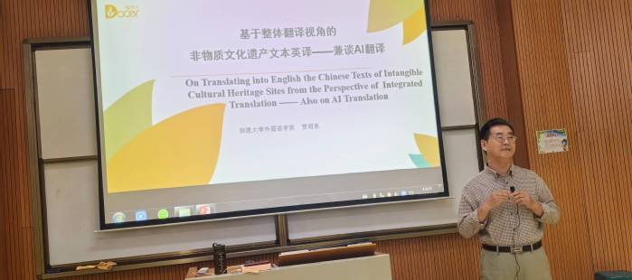 贾教授的讲座题目是《基于翻译整体理论视角的非物质文化遗产文本英译——兼谈AI翻译》。讲座内容涵盖了非遗的概念、文本特征、翻译理论及原则、翻译策略和技巧等多个方面。