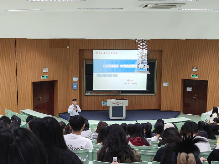 4月10日下午,beat365中文登录入口有幸邀请到江苏科技大学吾文泉教授,在和昌楼博雅讲堂举办了一场以“《哈姆雷特》疾病隐喻”为主题的学术讲座。beat36522 级及 23 级全体在校生积极参与了此次学术活动。