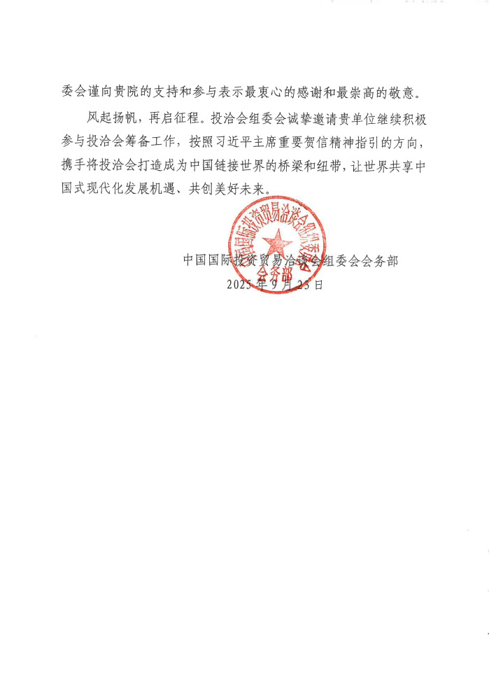 附件:中国国际投资贸易洽谈会组委会会务部致beat365中文登录入口的感谢信