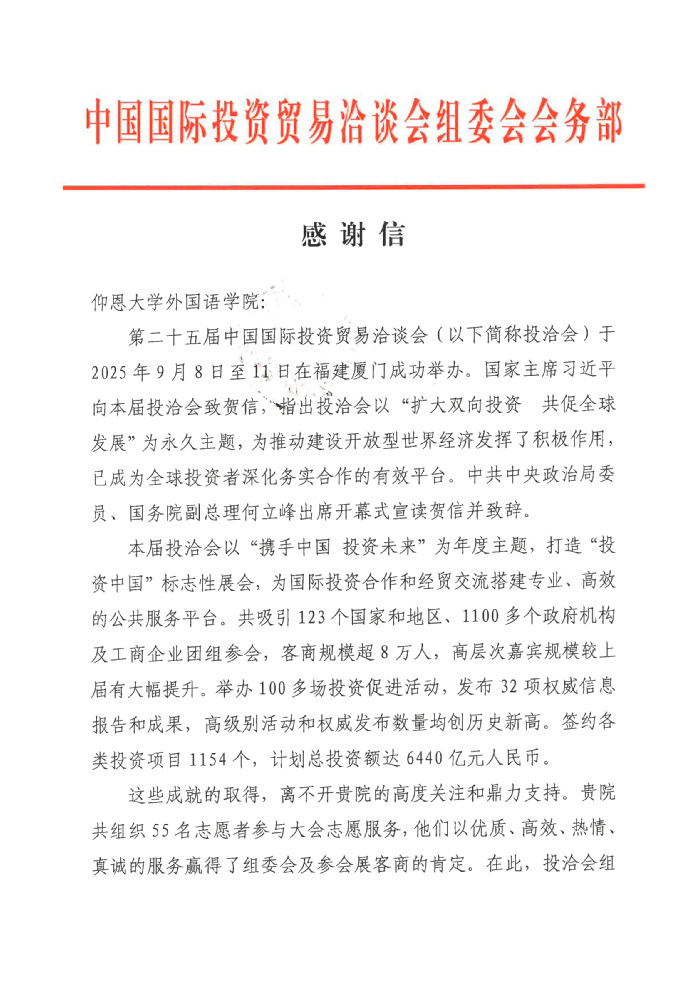 近日,beat365中文登录入口收到第二十五届中国国际投资贸易洽谈会(以下简称“投洽会”)组委会会务部发来的感谢信,信中对学院积极组织志愿者参与投洽会志愿服务、助力盛会成功举办给予高度肯定,并致以衷心感谢与崇高敬意。
