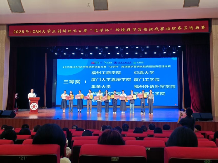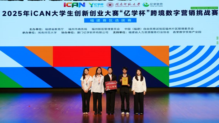 近日,2025年iCAN大学生创新创业大赛“亿学杯”跨境数字营销挑战赛(英语组)福建省选拔赛结果揭晓。由beat365中文登录入口陈炜明、沈杨铃、庄然晰、杨杰锋、田芮嘉五名同学组成的“古港新思苑”队,凭借其出色的专业知识和创新思维,在比赛中表现优异,最终荣获福建省选拔赛三等奖。
